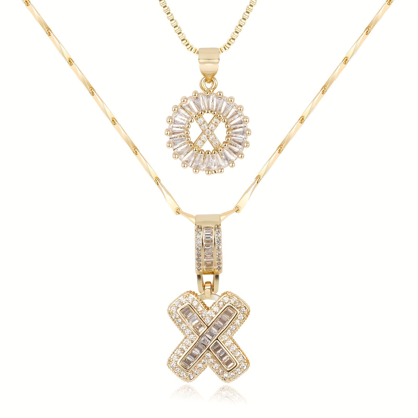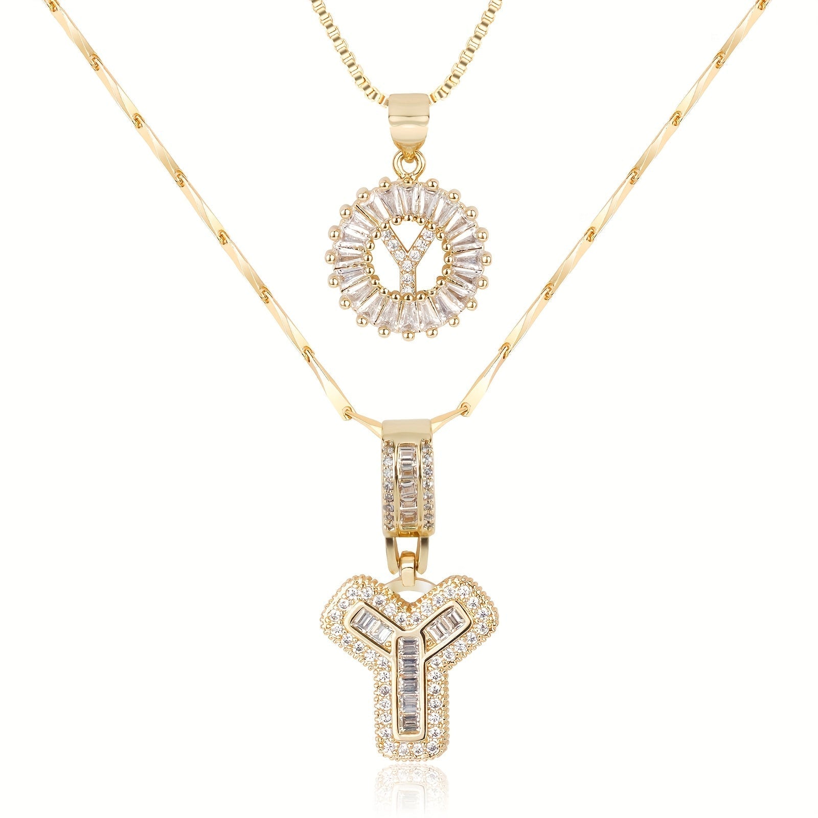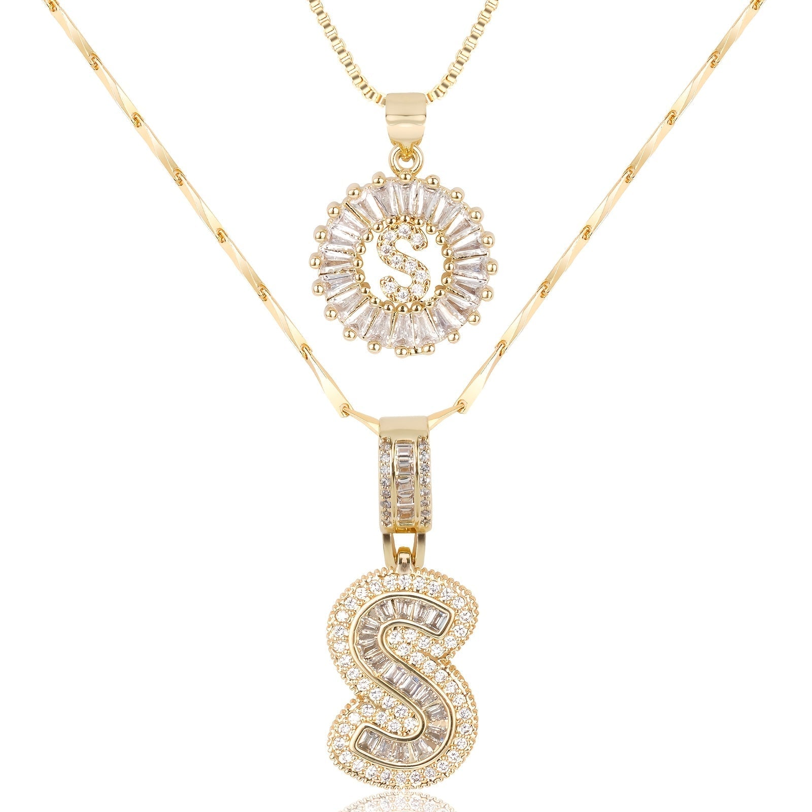 • Shorter Necklace: A dainty gold box chain with a baguette diamond circle pendant. At the center sits a delicate paved diamond initial, adding a subtle yet luxurious touch.