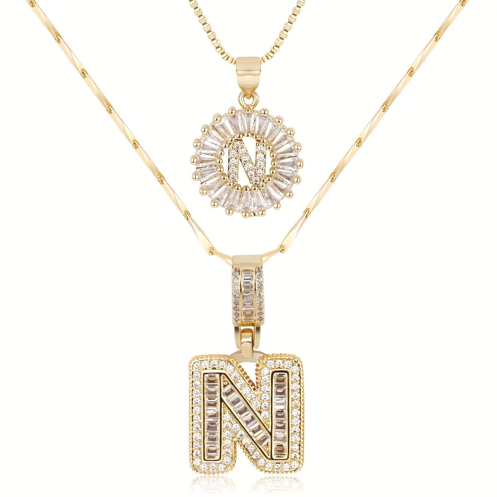 • Longer Necklace: Features a slightly thicker and more structured chain, with a larger diamond initial that creates a bold yet elegant contrast to the shorter piece. The mix of textures and sizes makes this set versatile and eye-catching.